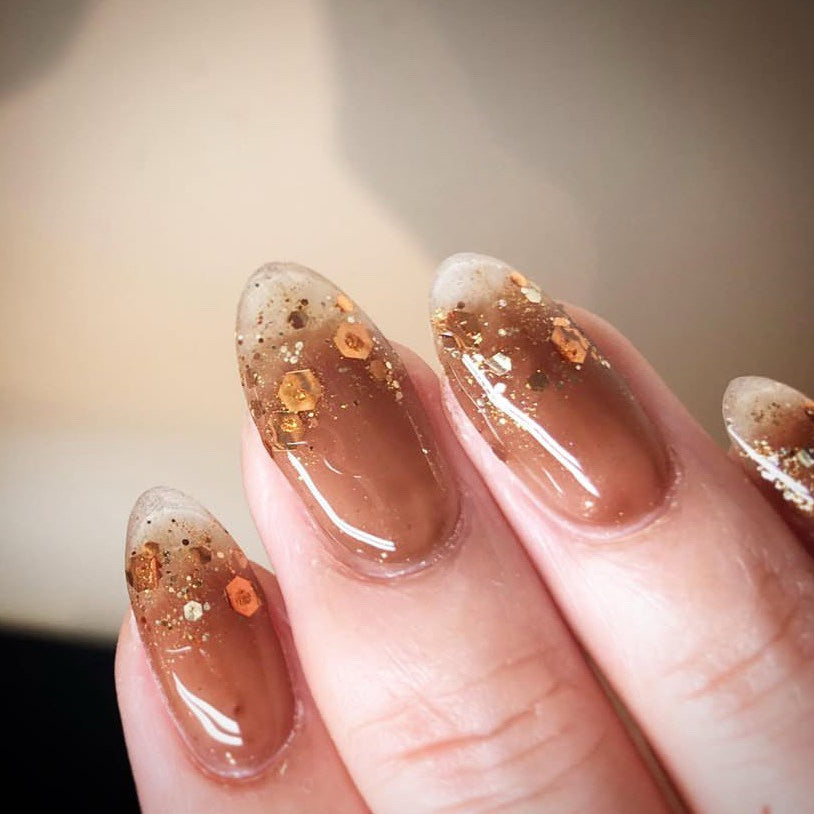 Apply Color: Using a gel application brush, apply Kokoist E-240S Marrone Brown Glass Gel in thin layers, curing each layer under a UV or LED lamp. Apply as many layers as needed to achieve your desired opacity, though most people will only need one layer for full coverage.